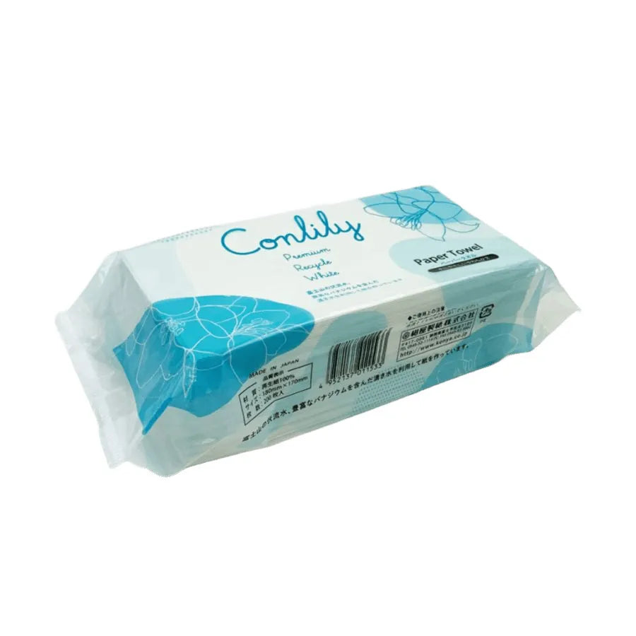 コンリリープレミアムリサイクルホワイトは、再生紙100%でありながら、ふんわりとしたソフトな肌触りを実現したペーパータオルです。